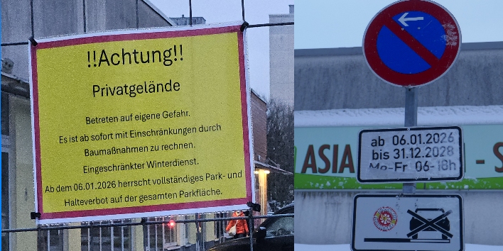 - Ab 6. Januar 2026 wurden zu den ca. 150 verlorenen Parkplätzen auf dem Baugelände weitere ca. 50 Anwohner Parkplätze für das Bauvorhaben gesperrt.